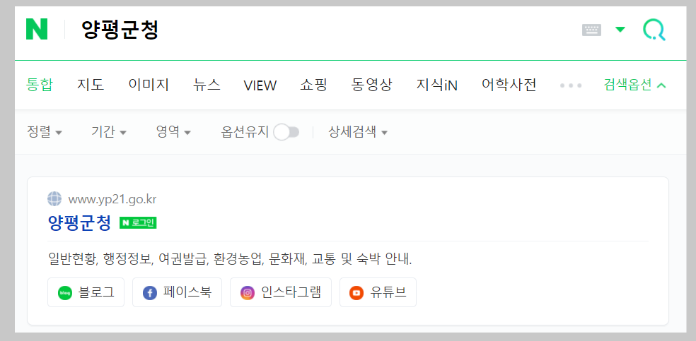 위 화면은 네이버에서 양평군청이라고 검색을 했을때의 검색결과입니다. 가장 맨위의 검색결과를 클릭을 하시면 사이트에 들어가실 수 있습니다. 또한 네이버에서 검색을 할 경우에는 블로그와 페이스북도 같이 나오기 때문에 여러모로 편리한 점이 있습니다.