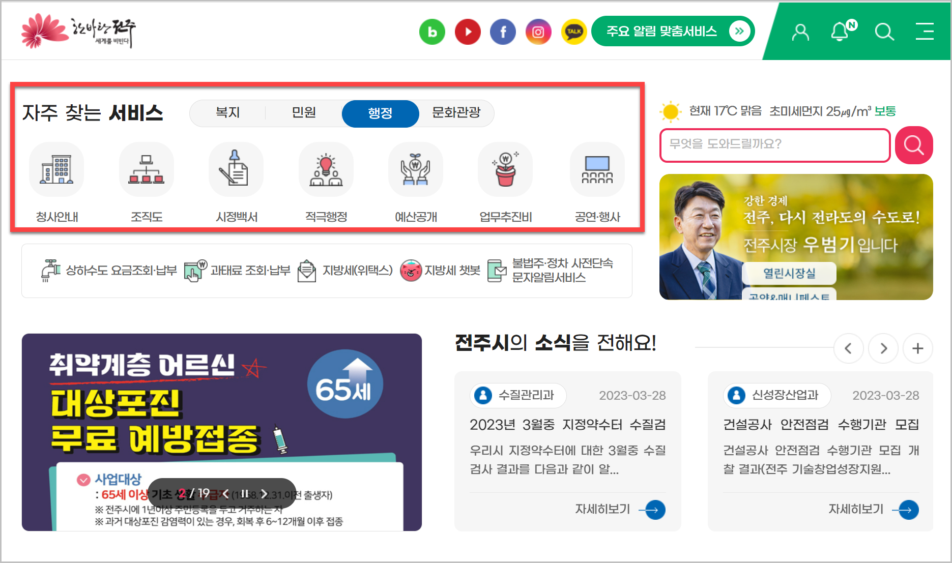 웹사이트가 들어가면 이러한 화면이 나옵니다. 왼쪽 상단을 보면 자주찾는 서비스라고 되어 있습니다. 복잡한 메뉴는 우측으로 숨겨버리고, 사람들이 자주 찾는 메뉴를 전면에 배치하는 것은 너무 좋은 것 같습니다. 복지, 민원, 행정과 관련된 소식을 쉽게 확인할수 있도록 되어 있습니다. 문화관광의 경우에는 별도의 웹사이트로 만들어 졌네요.