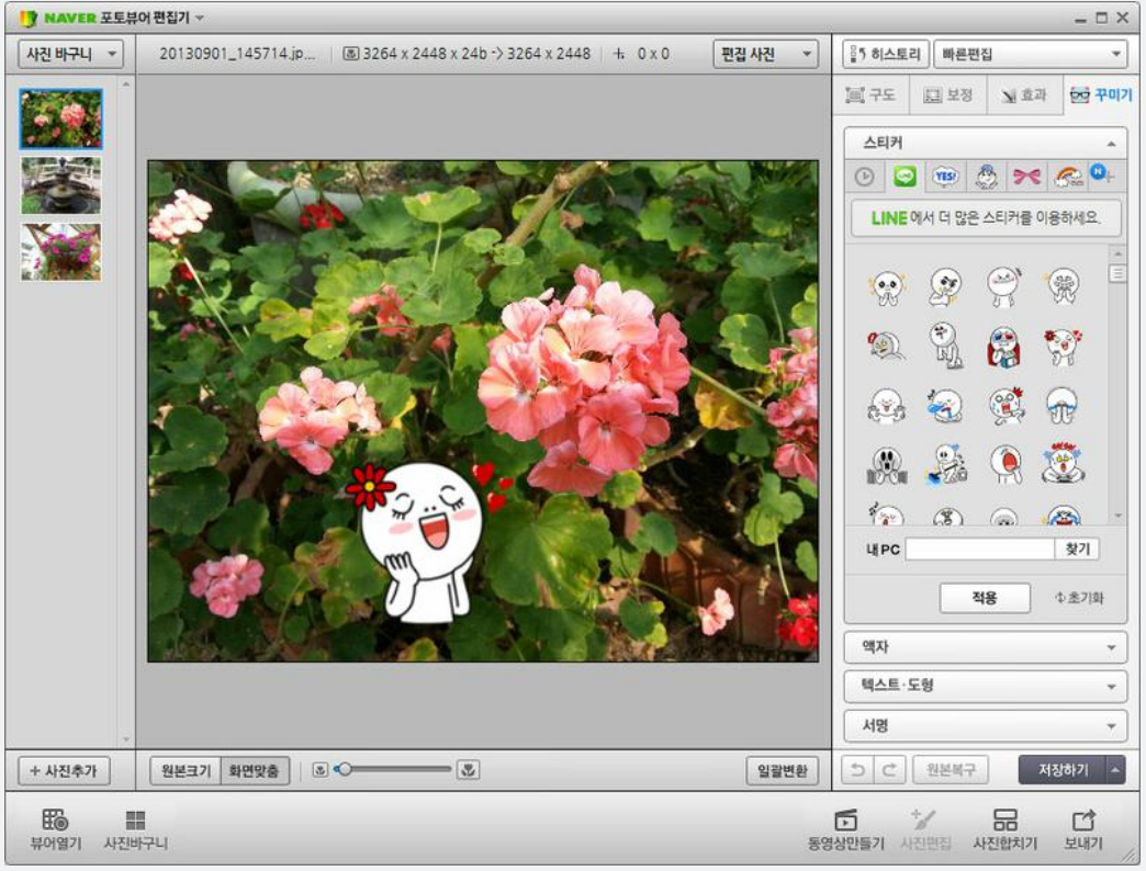 간단히 사진 편집또한 가능합니다. 라인에서 제공하는 다양한 스티커를 이용할수 있을 분만아니라, 구도와 보정 그리고 효과까지 줄 수 있습니다.
