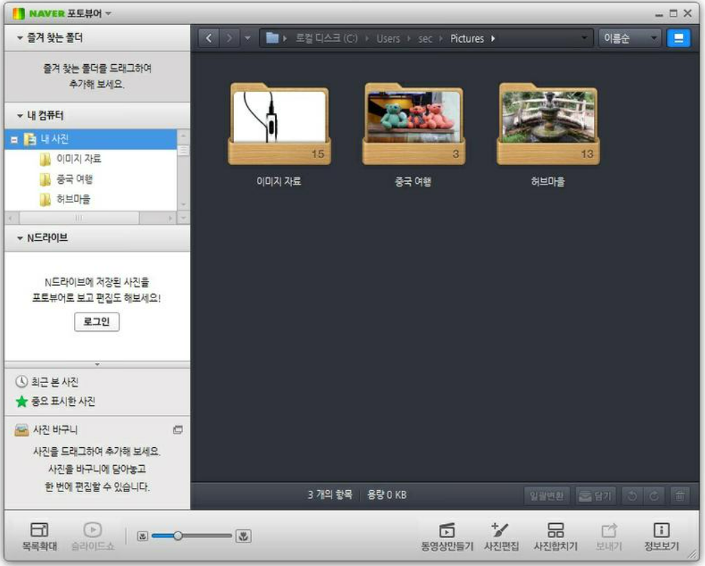 네이버 포토뷰어의 기본 외관은 위와 같습니다. 오른쪽 목록에서는 사진이나 저장된 폴더와 같은것을 확인할수 있도록 되어 있습니다. 좌측에는 트리구조의 폴터를 확인할수 있고, 과거의 N드라이브를 활용할수 있도록 되어 있습니다. (이 기능은 이제 이용못하겠지요)
