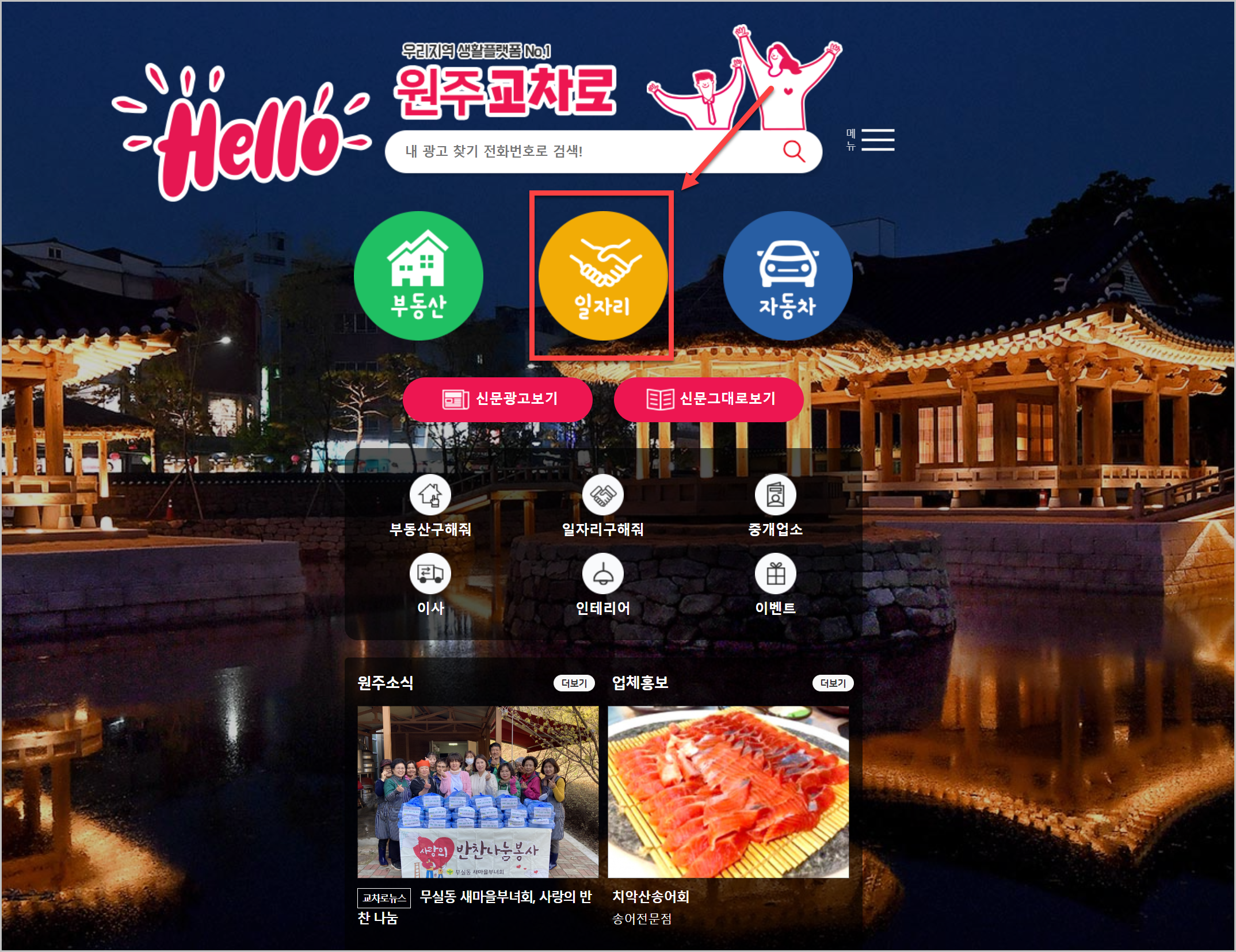 해당 사이트에 들어가면 이런 화면이 나옵니다. 요즘에 교차로신문의 메인페이지는 이러한 모습으로 되어 있는 경우가 많이 있는것 같더라구요. 여기 보시면 가운데에 ‘일자리’라고 되어 있습니다. 이걸 클릭하시면 많은 구인구직 정보를 확인할 수 있습니다.