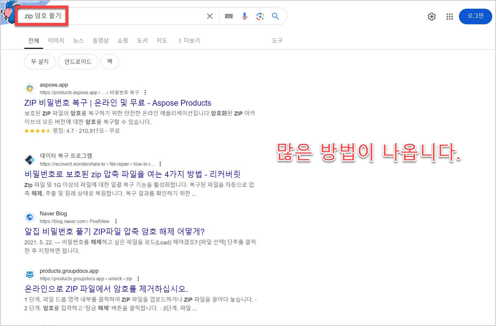 물론 압축 시스템 zip 을 통해서도 어느정도 가능하지만, 이는 파훼법이 나와 있다고 알려져 있습니다. 물론 저는 할줄 모르지만, 여러 툴이 있는것으로 알고 있습니다. 그래서 이러한 zip을 통해서 암호화 하기 보다는 별도의 프로그램을 이용하는것이 좋습니다.