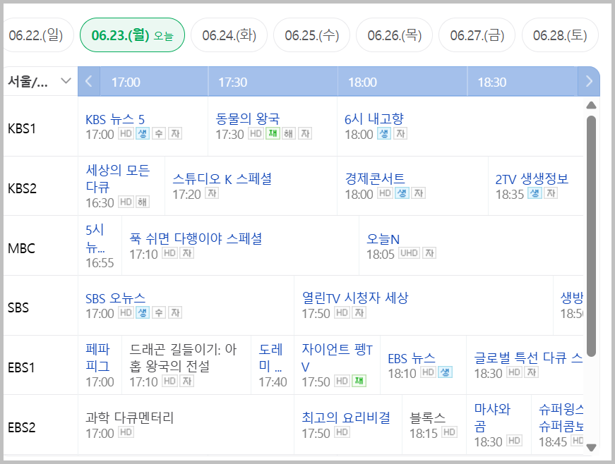 오후시간 TV에 보면 정말 다양한 프로그램을 하고 있습니다. 네이버에서 편성표라고 검색을 하면 다음과 같은 화면들이 나오게 됩니다.