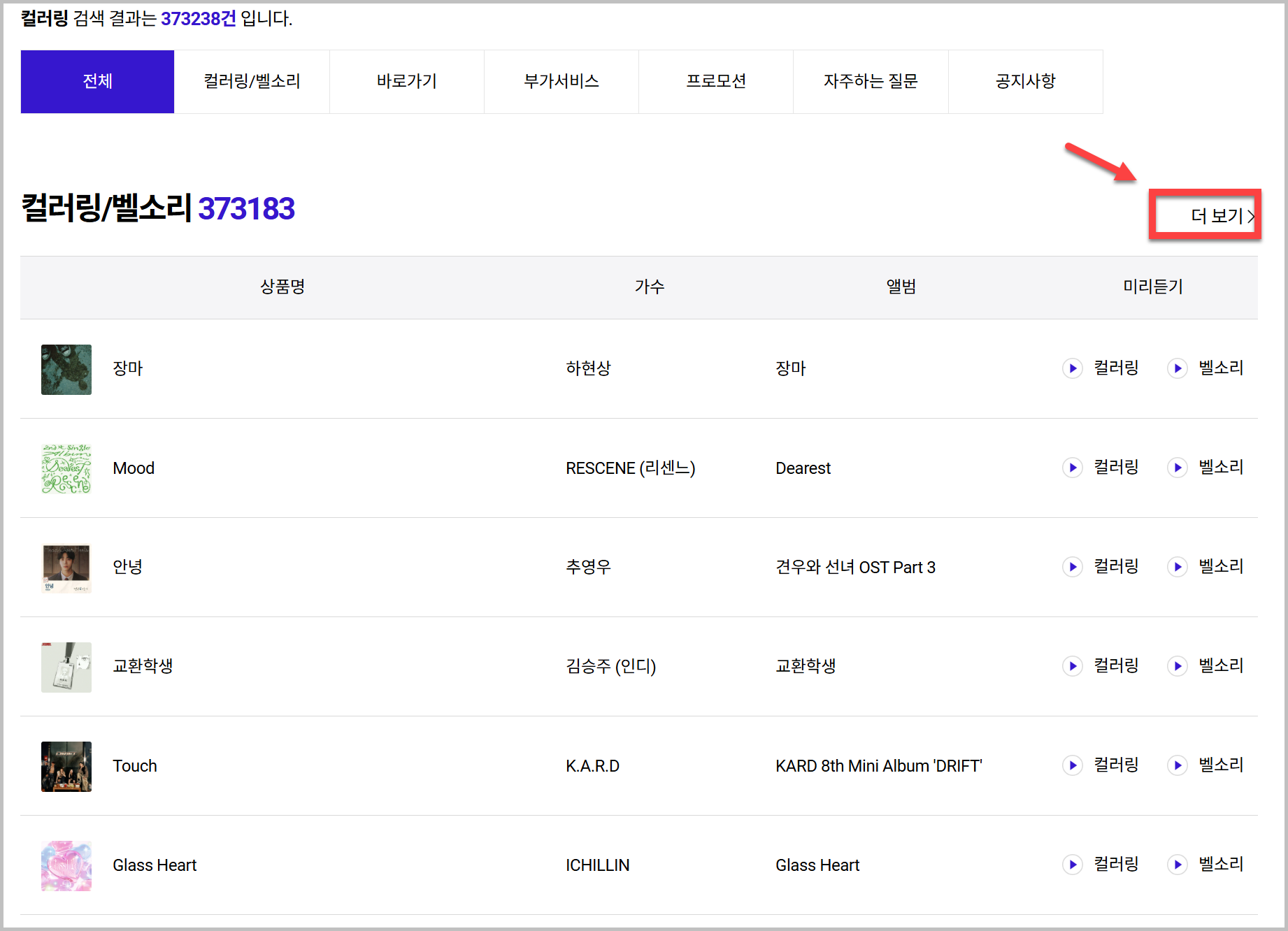 3) 그러면 컬러링/벨소리 항목이 나옵니다. 여기서 선택하시면 됩니다.