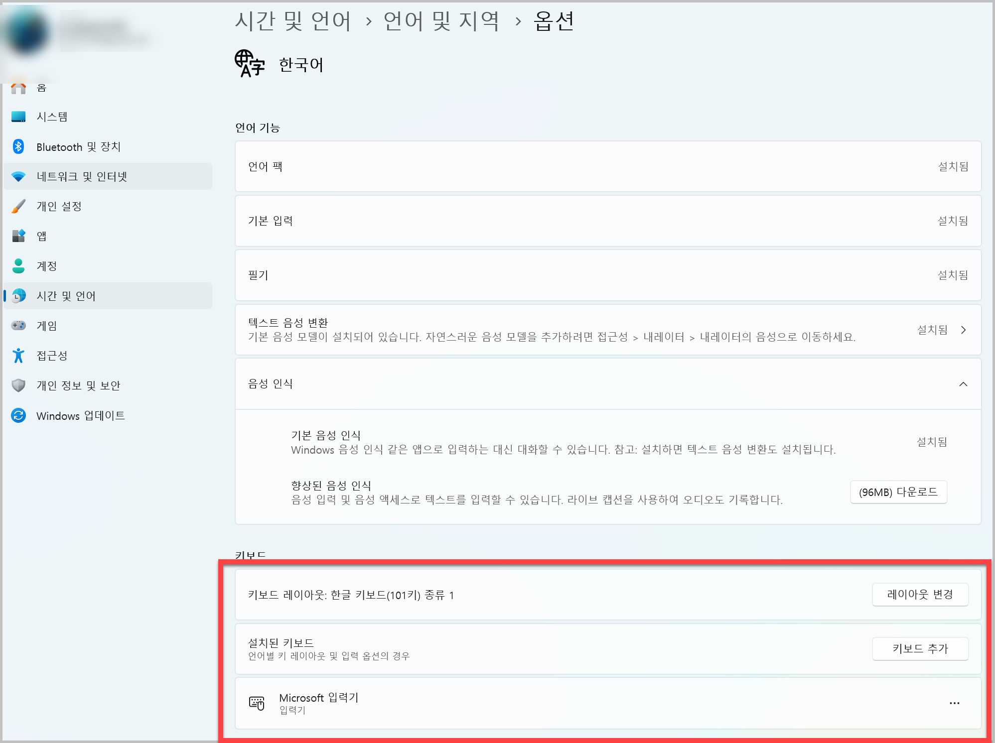 - 한국어(대한민국) 언어 옵션에서 Microsoft 입력기를 제거 후 다시 추가