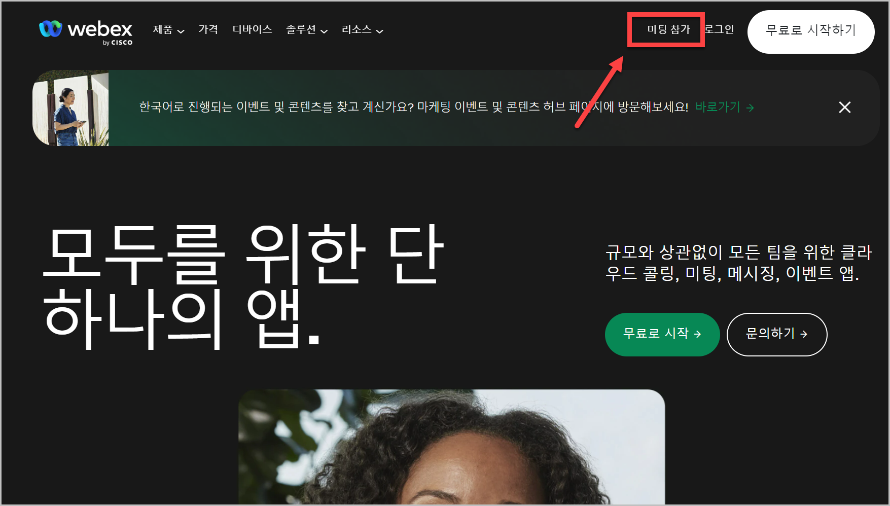 홈페이지에 들어가면 위와 같은 화면이 나오는데 우측 상단에 있는 '미팅참가'를 누르고 회의 호스트가 제공하는 미팅번호를 입력을 하시면 회의에 간단하게 참여를 할 수 있습니다. 이러한 방식은 줌도 동일 합니다.