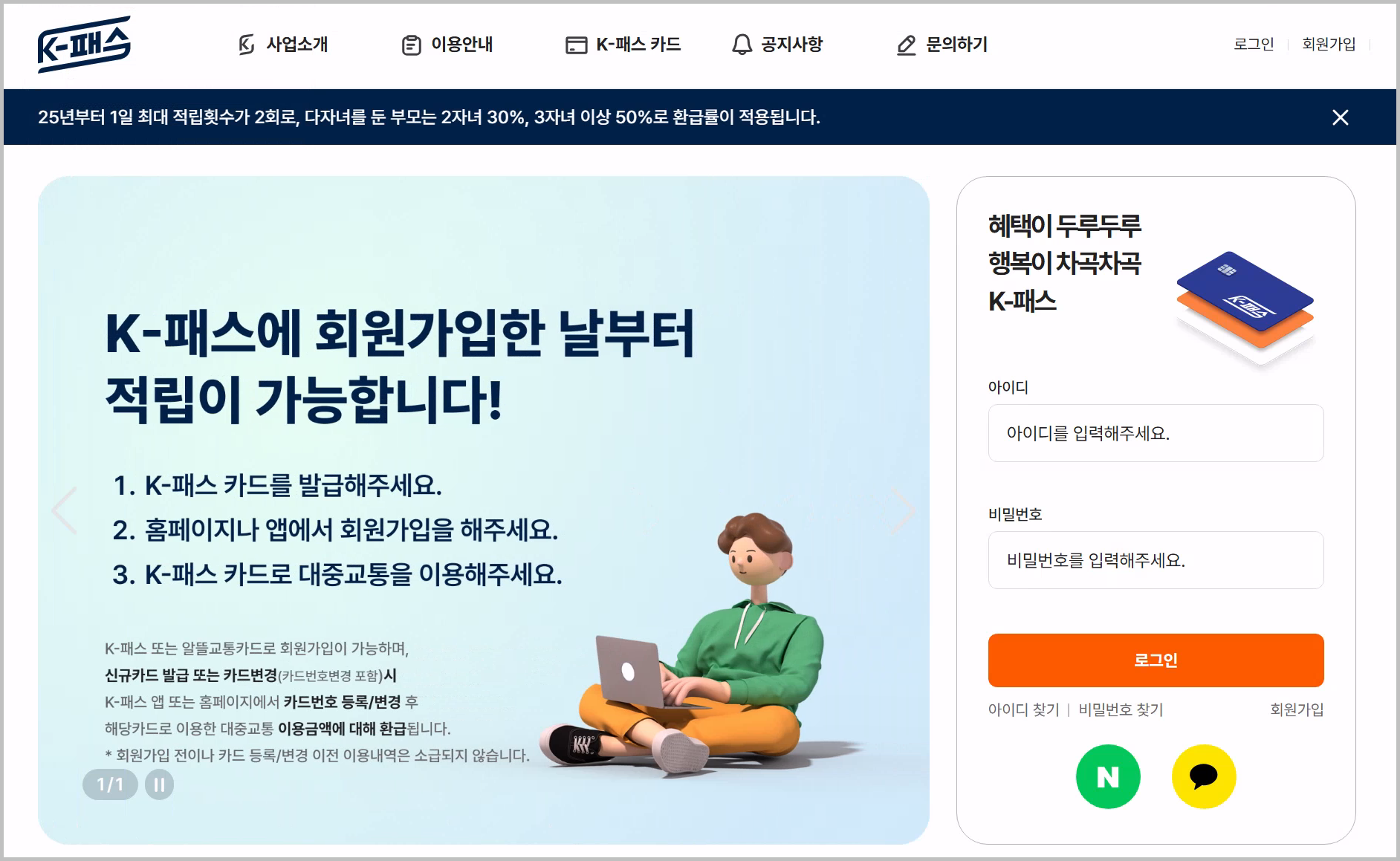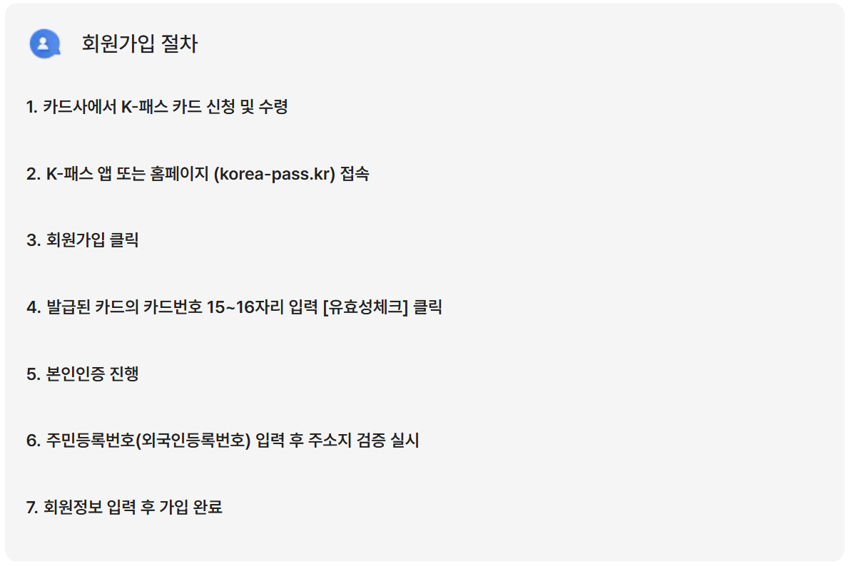 신청 과정은 크게 카드 발급과 회원 등록으로 나뉩니다. 먼저 K-패스 기능이 포함된 교통카드를 발급받아야 합니다.