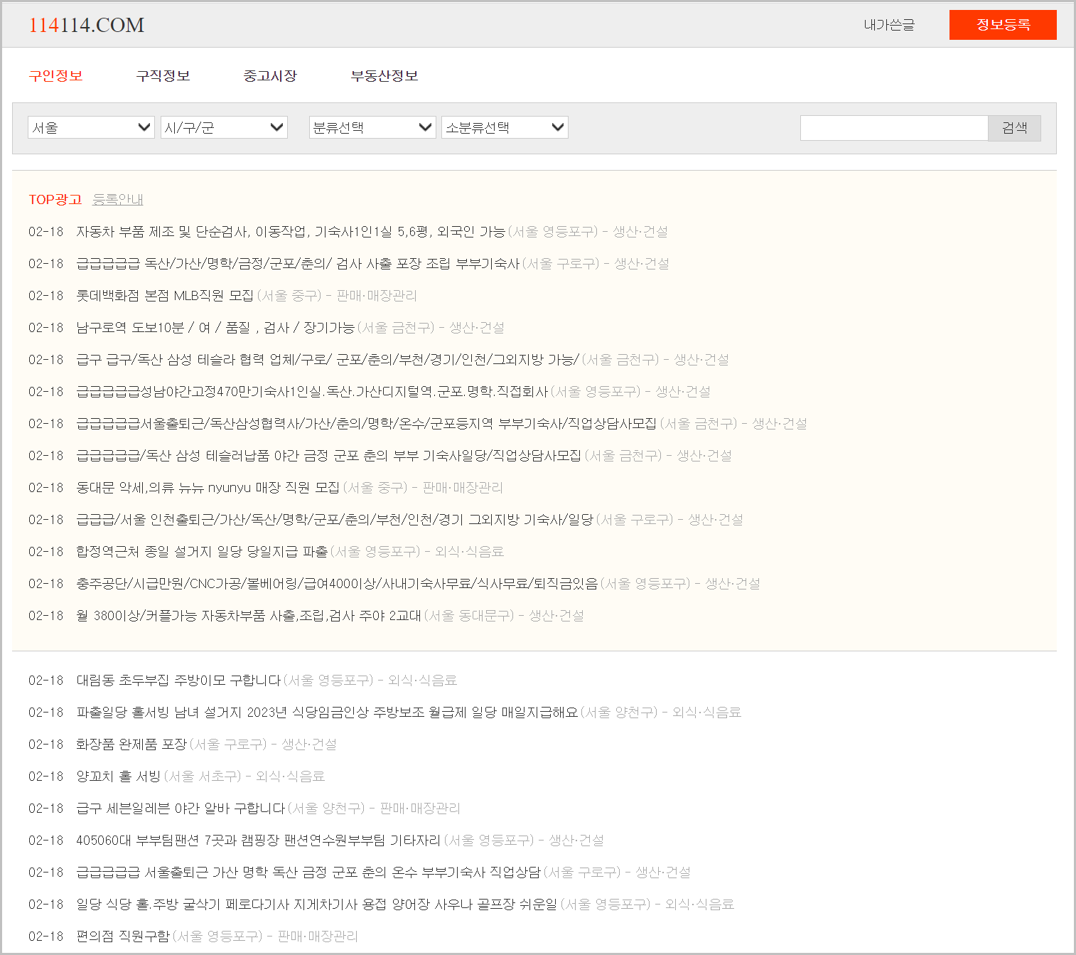 위와 같은 모습이 보입니다. 다른 일자리 사이트와 마찬가지로 114114구인구직 홈페이지 역시 가장 맨위에는 광고가 올라와 있습니다. 이를 통해서 수익을 얻는것으로 보여집니다.