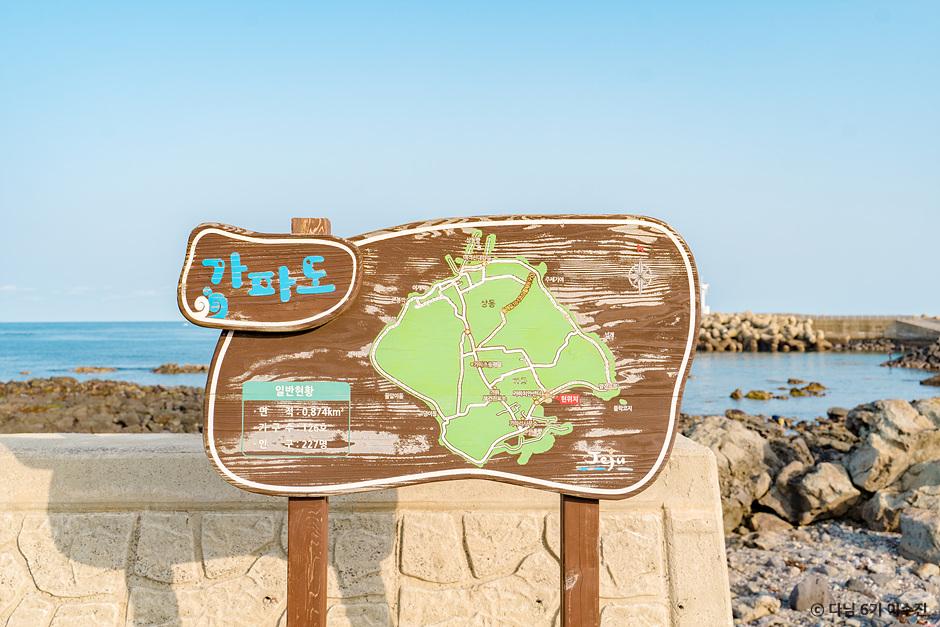 가파도는 제주특별자치도 서귀포시 대정읍에 속해 있으며 모슬포항에서 남쪽으로 약 5.5km 떨어져 있습니다. 제주 본섬과 최남단 마라도 사이에 위치하고 있어 두 곳을 모두 조망하기에 최적의 장소입니다. 섬의 최고 높이가 해발 20m에 불과하여 키 작은 섬이라는 별칭이 붙을 만큼 평탄한 지형이 특징입니다.