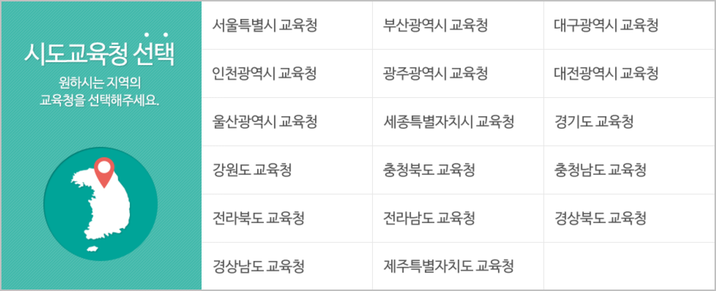 위와 같은 화면이 나오면 자신의 자녀가 있는 교육청을 선택하시면 됩니다. 그러면 원하는 사이트로 쉽게 들어가실 수 있습니다. 지역별로 다른 웹사이트가 존재하고, 통합이 되어 있지 않습니다.