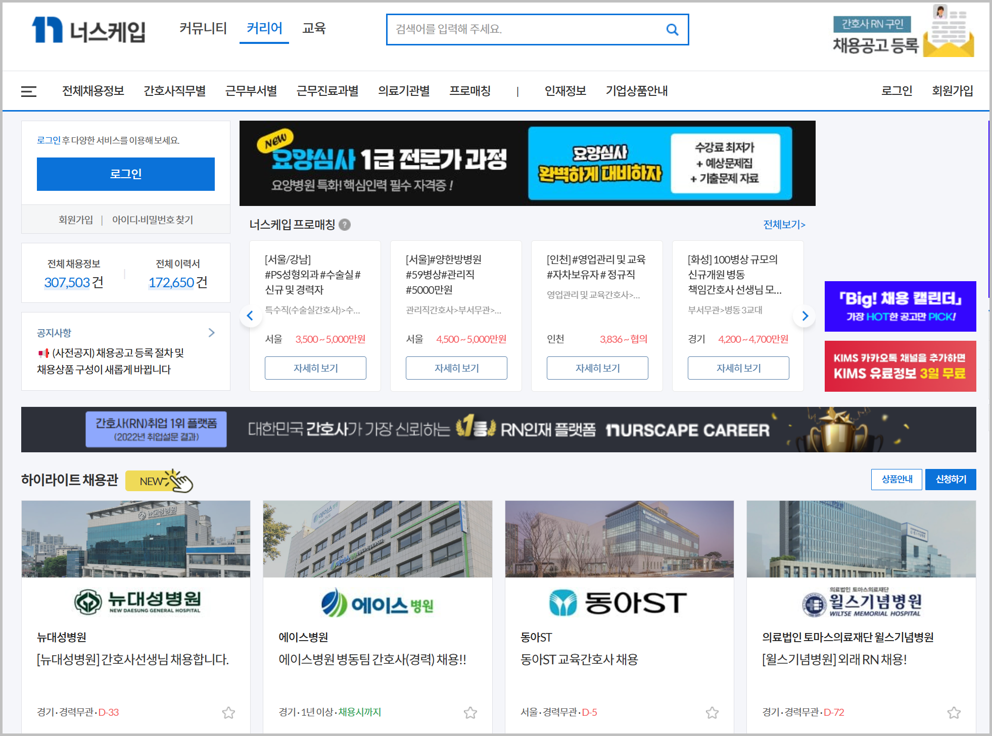 간호사의 경우 대표적인 전문 취업 플랫폼으로 너스케입 커리어가 있습니다. 이 사이트는 단순한 채용정보 제공을 넘어서, 간호사들이 서로 소통할 수 있는 커뮤니티 기능도 함께 제공하고 있어 실질적인 도움을 받을 수 있는 공간입니다.