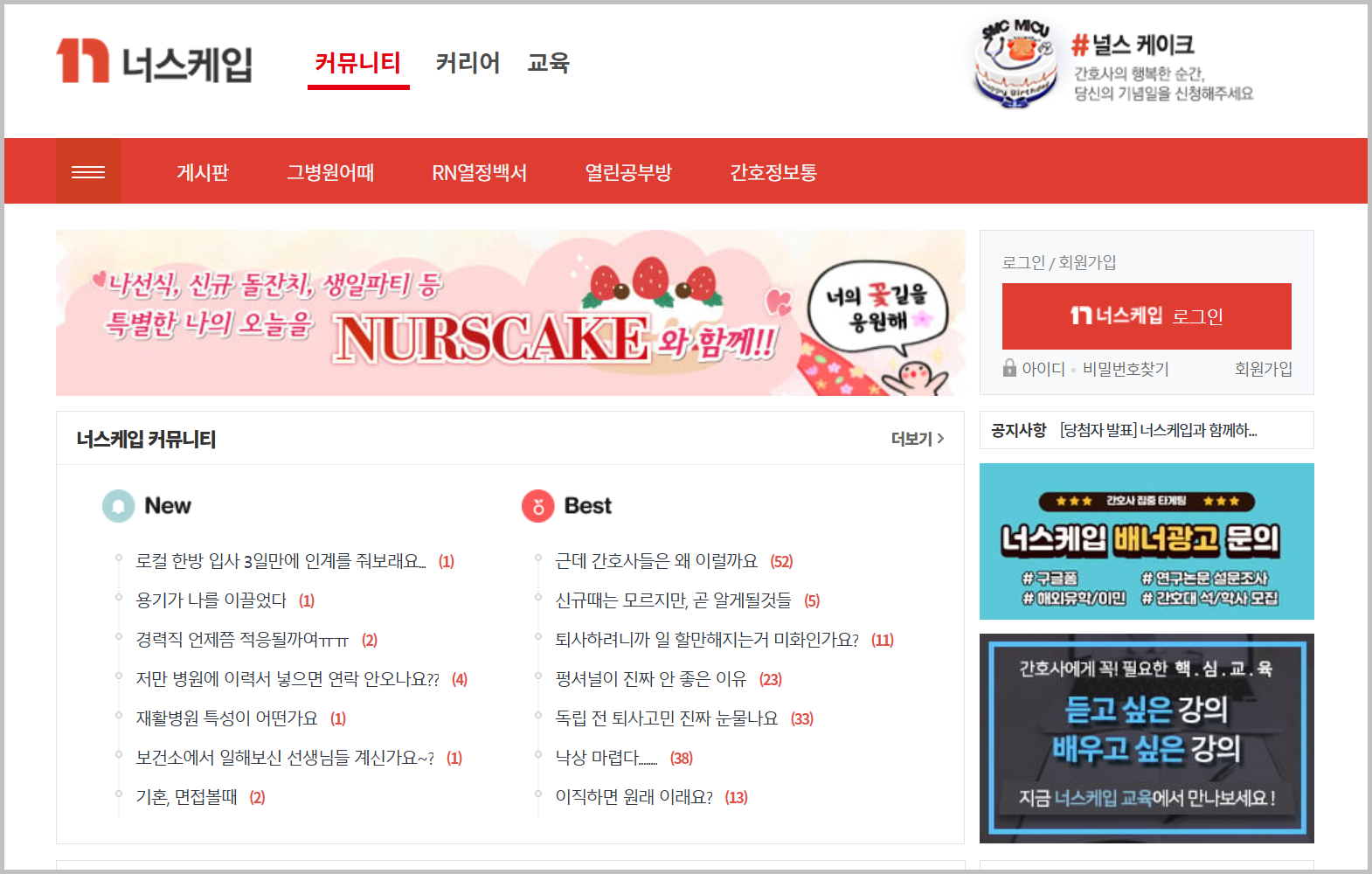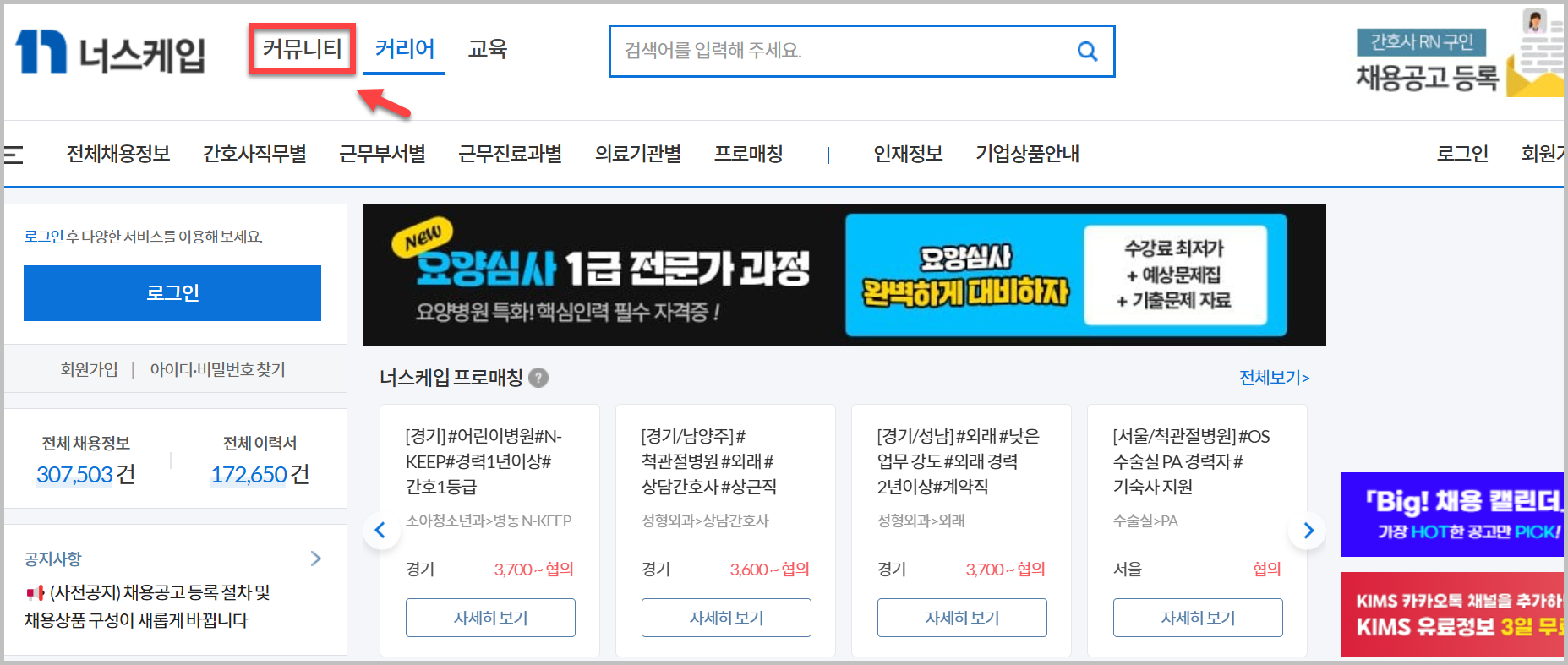 너스케입 커리어의 또 하나의 강점은 활발한 커뮤니티 기능입니다. 상단 ‘커뮤니티’ 메뉴로 들어가면 다양한 게시판이 운영되고 있으며, 현직 간호사들의 생생한 경험과 정보를 공유하는 공간이 마련되어 있습니다.