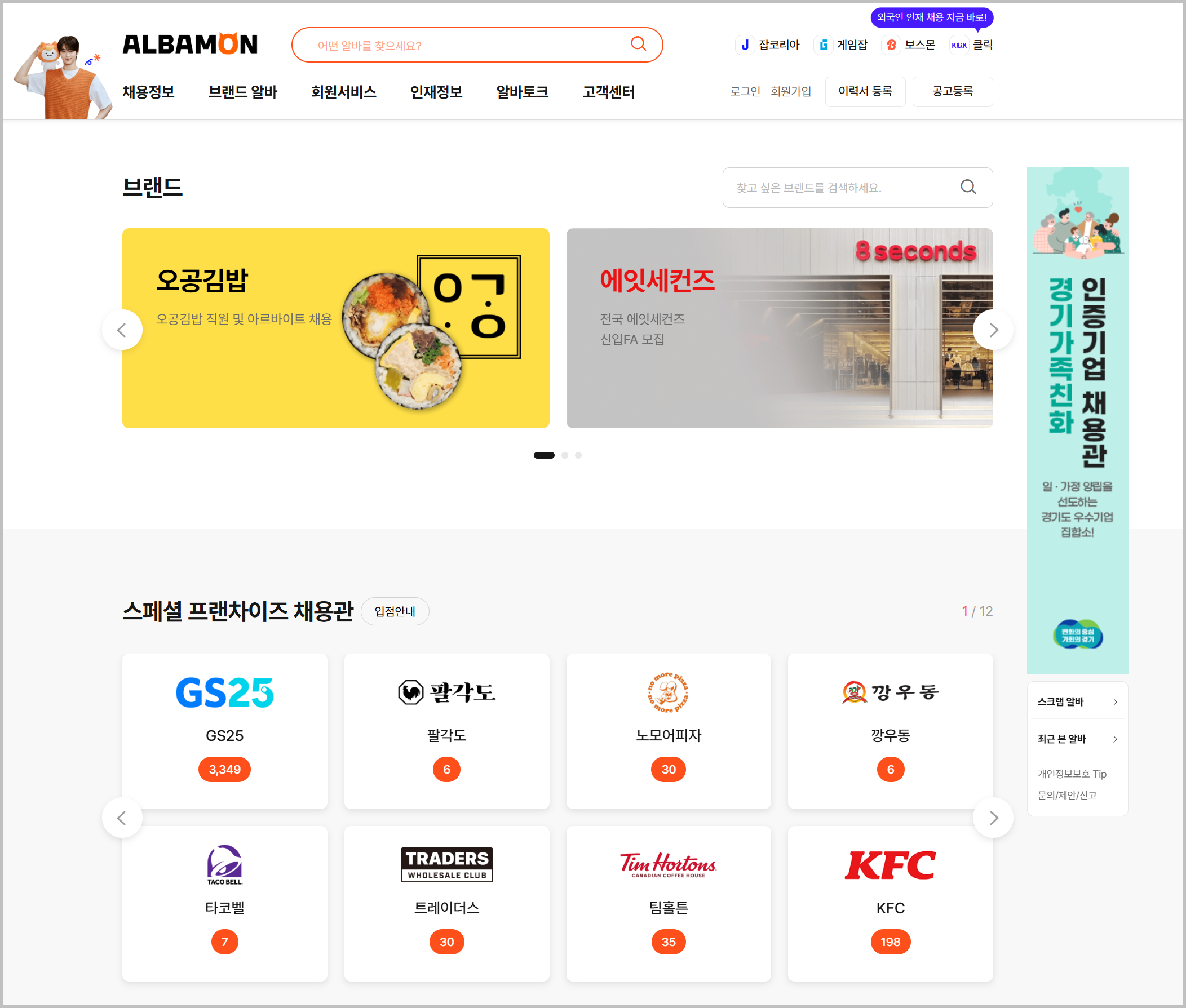 브랜드 알바라는 메뉴도 있습니다. 요즘에는 프렌차이즈에 대한 일자리를 선호하는 경우도 많이 있습니다. 그 이유는 대우를 어느정도 예측이 가능하고, 근무환경 역시 예측이 가능하기 때문이지요. 얼마나 힘들지 예상 가능하다는것, 돈을 얼마받는지 예상가능하다는것이 최대의 장점이 아닐까 싶습니다.
