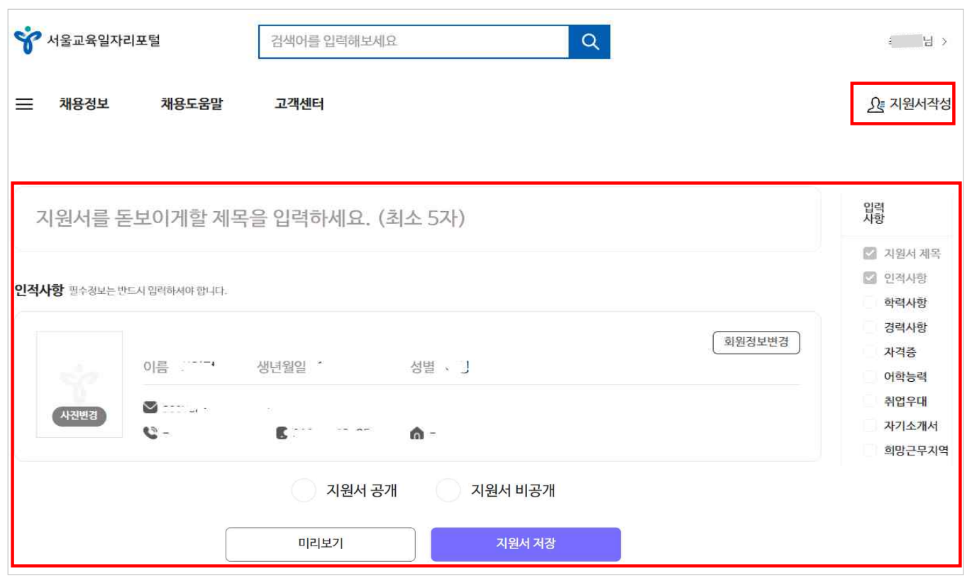 작성한 지원서는 채용당담자가 구직자 정보 조회가 가능합니다. (공개로 설정했을경우에) 기관의 채용 방법 중 직시 지원인 경우에 활용이 가능합니다.