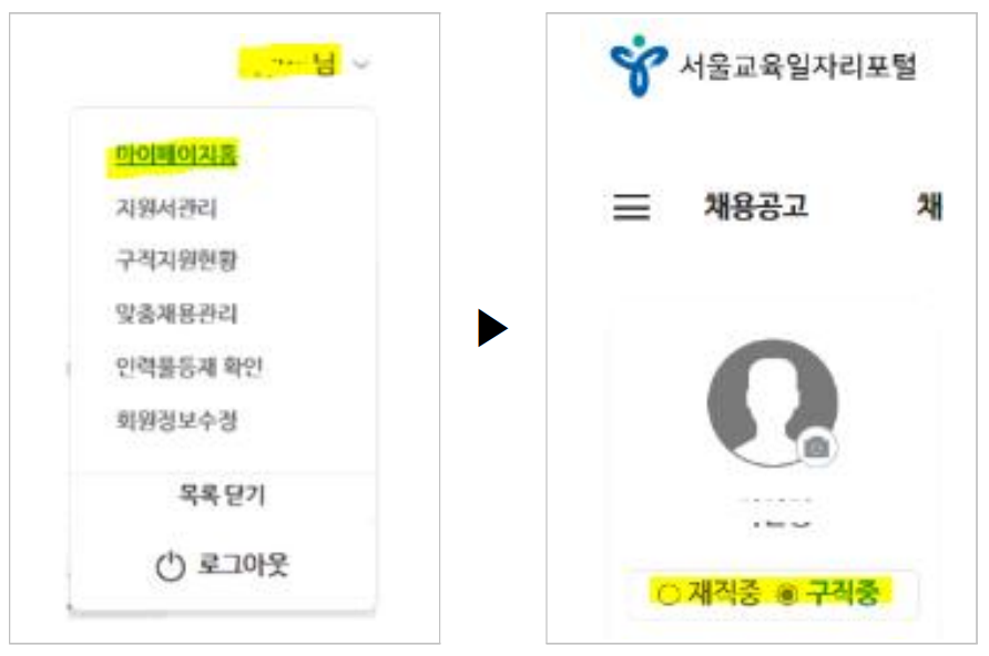 로그인 한후에 우측상단 회원명을 클릭한 다음에 -> 마이페이지 홈 클릭하고 -> 사진란 아래 재직중/구직중 항목을 바꿀수 있습니다.