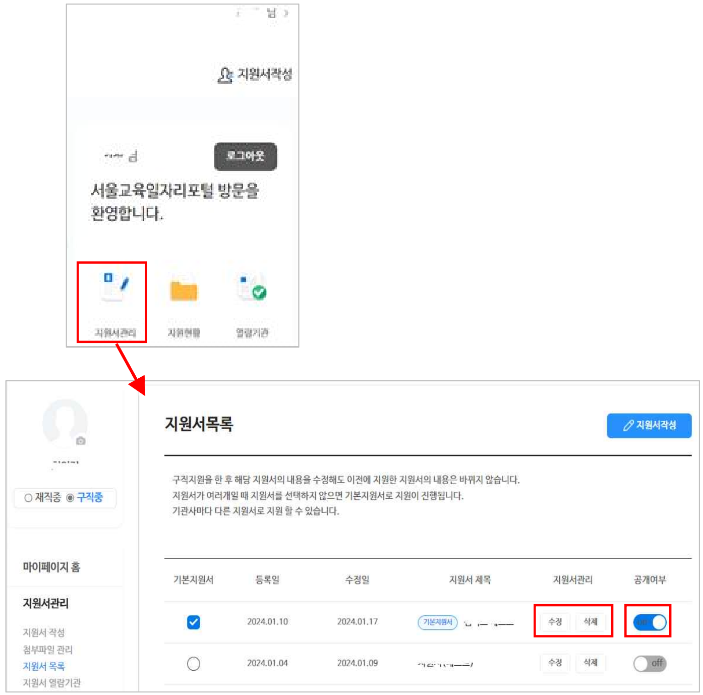 우측 상단 '지원서 관리'라고 되어 있는것을 클릭해서 들어가시면 지원서 목록에서 수정/삭제, 공개여부를 할수 있습니다. 편리하게 관리할수 있습니다. 민간 사이트를 많이 참고한것으로 보여집니다.