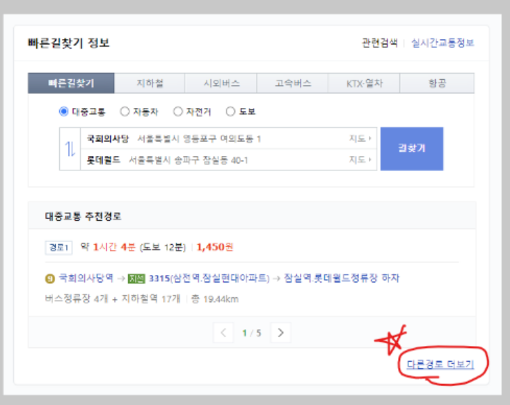 저는 예를들어서 국회의사당에서 롯데월드로 가는것을 검색을 해봤습니다. 그러면 위와 같은 결과가 나오게 됩니다. 이 결과가 마음에 들지 않는 경우에는 우측 하단에 있는 다른경로 더보기를 선택을 하시면 됩니다.