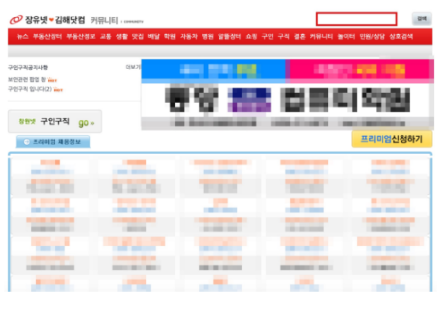 장유넷 구인구직 사이트는 크게 두 부분으로 나누어 집니다. 상단의 프리미엄 채용정보와 하단의 일반 채용정보입니다. 상단의 프리미엄 채용정보는 장유넷의 수입원중 하나인 광고로 이루어지는 구인구직 입니다. 반면에 하단의 구인구직 정보는 게시판 형식의 구인구직 정보가 올라오는 곳 이지요.