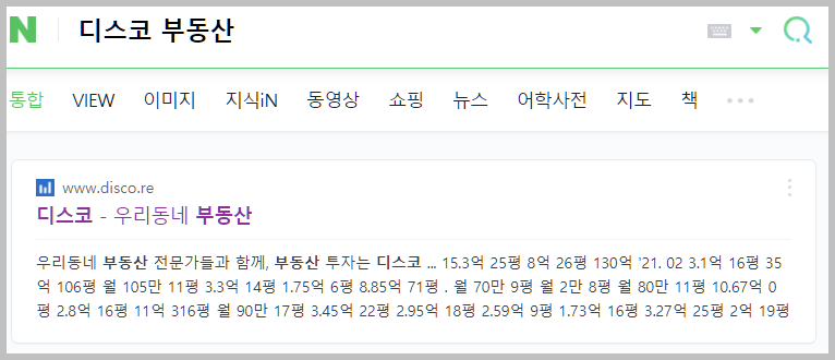 네이버에서 검색을할때 '디스코'라고 검색을 하면 너무 많은 검색결과가 나오게 됩니다. 하지만 명확하게 '디스코 부동산'이라고 검색을 하면 손쉽게 원하는 결과를 볼 수 있습니다.