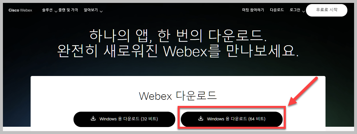 우측 상단에 있는 다운로드를 클릭을 하며 Webex meeting 다운로드 페이지로 들어갈 수 있습니다.