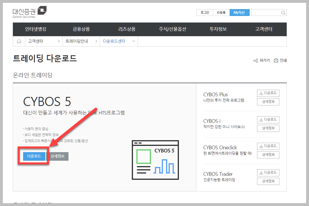 해당 사이트로 들어가시면 위와 같은 화면을 보게 됩니다. 여기에서 '다운로드'를 클릭을 하시면 대신증권 CYBOS 5를 다운로드 할 수 있습니다.