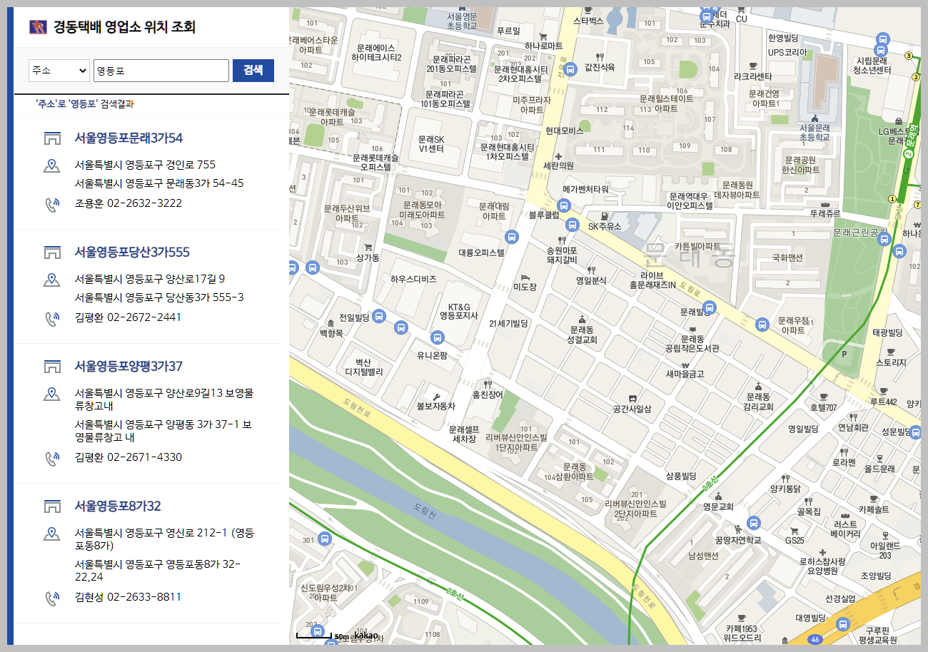 위 링크를 클릭을 하시면 경동화물 지점조회가 가능한 페이지로 들어가실 수 있습니다. 여기에서 자신의 주소를 검색을 하시면 근처에 있는 경동화물 지점조회가 가능합니다. 집 근처에 있으면 직접 물건을 가지고 가서 택배를 붙이면 됩니다.