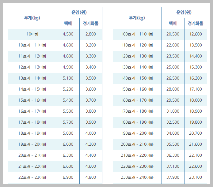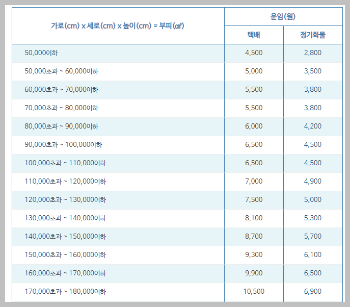 중대형 화물의 무게가격은 위와 같습니다. 워낙 무게에 대한 기준이 많기 때문에 [이곳]을 참고해 보시면 완벽한 가격을 확인할 수 있습니다. 당연한 이야기지만, 부피가격이나 무게가격 둘중에 큰 값을 적용하게 됩니다. 무게가 가볍더라도 부피가 크면 부피가격으로 적용을 하게 됩니다.