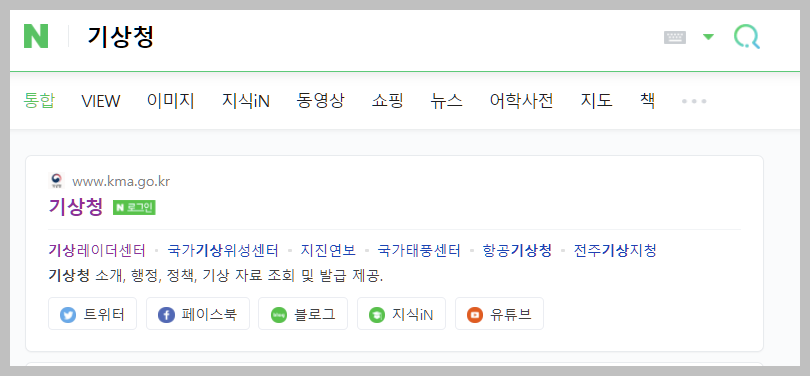 위 그림은 네이버에서 '기상청'이라고 검색을 했을때의 검색결과입니다. 기상청 홈페이지는 크게 2가지가 있습니다. 하나는 기상청 자체 홈페이지고 다른 하나는 날씨를 알려주는 기상청 날씨누리 홈페이지입니다. 네이버에서는 가장 첫번째로 날씨를 알려주는 홈페이지로 연결을 해 줍니다.