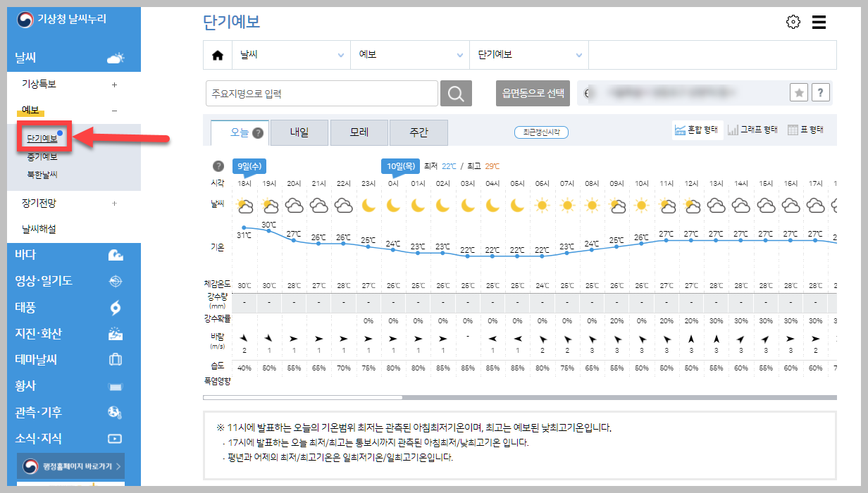 예전에는 기상청 날씨누리 동네예보라는 페이지가 별도로 존재를 하였습니다. 하지만 최근에 홈페이지가 개편이되면서 이러한 이름은 더이상 사용이 되고 있지 않습니다. 이와 동일한 역할을 하는것은 단기예보입니다.
