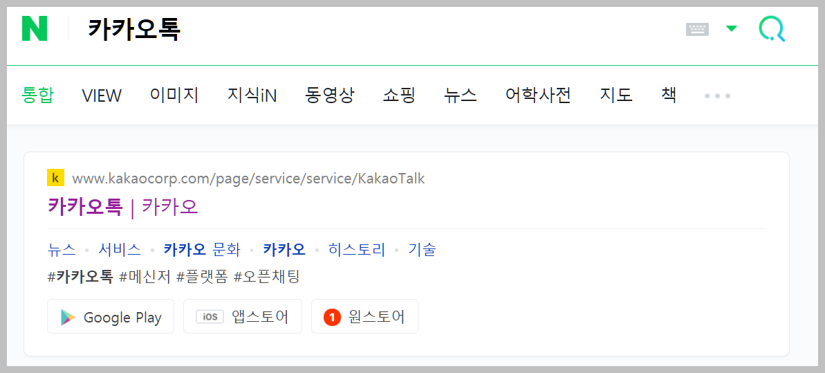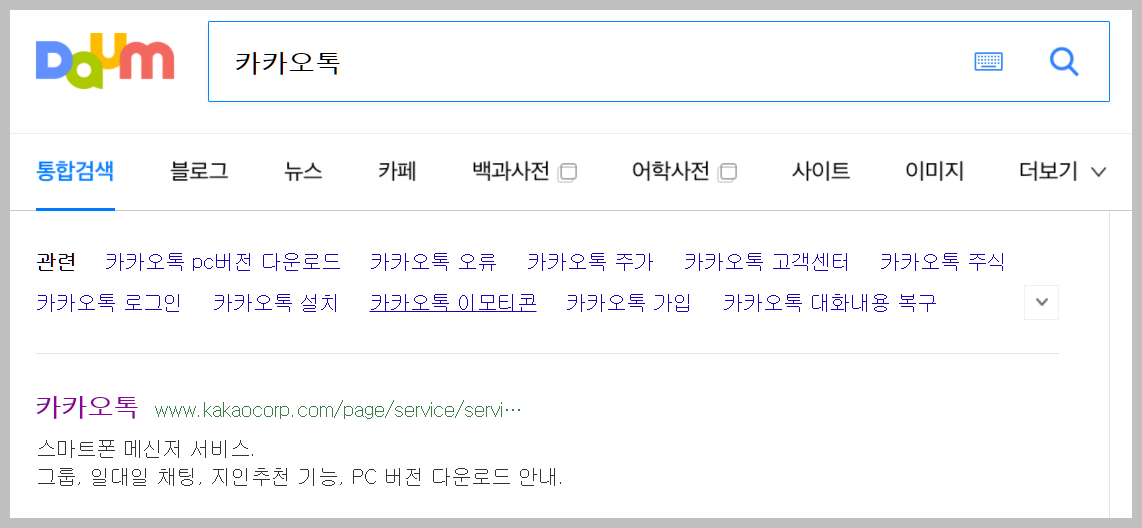 위의 화면처럼 네이버, 다음과 같은 사이트에서 간단하게 '카카오톡'이라고 검색을 하면 문제없이 홈페이지를 찾을 수 있습니다.