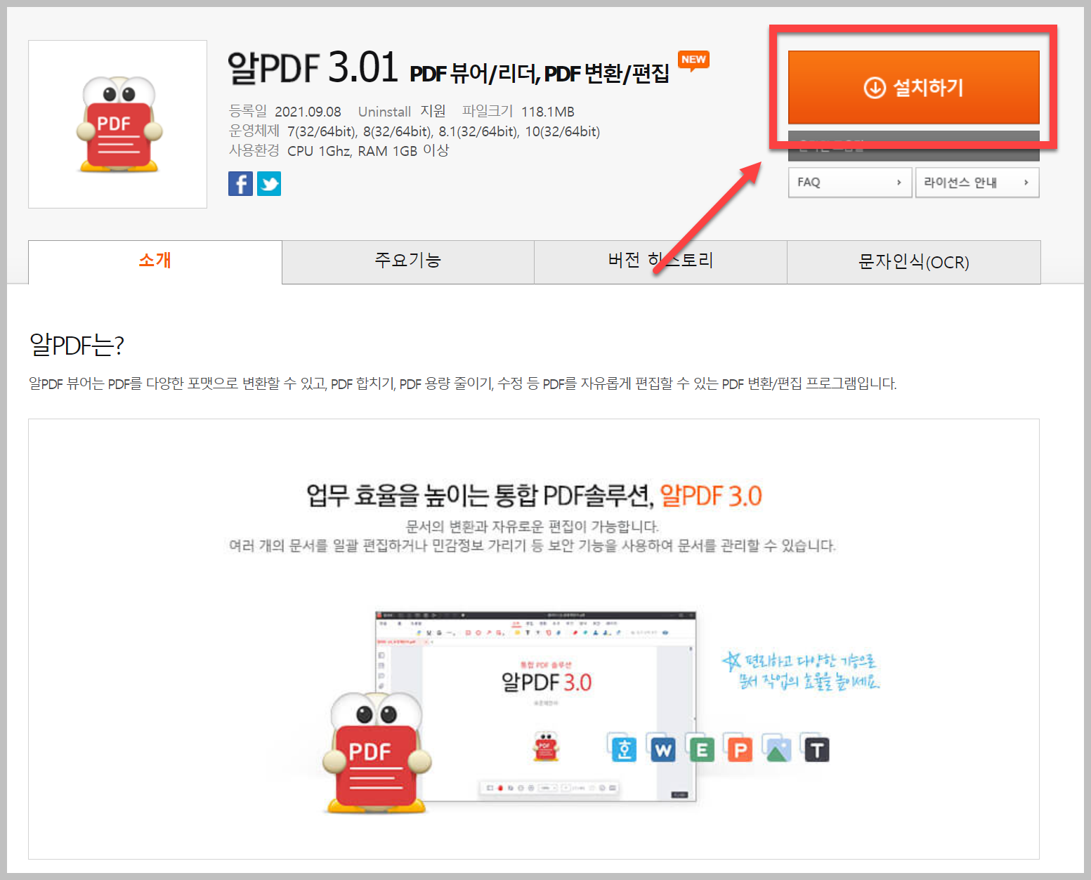 홈페이지에 들어가면 위와 같은 화면이 나옵니다. 여기에서 '설치하기'를 클릭을 하시면 RPDF 다운로드가 진행이 됩니다. 그리고 다운로드 받은 파일을 실행을 하면 알피디에프 설치가 진행이 됩니다.