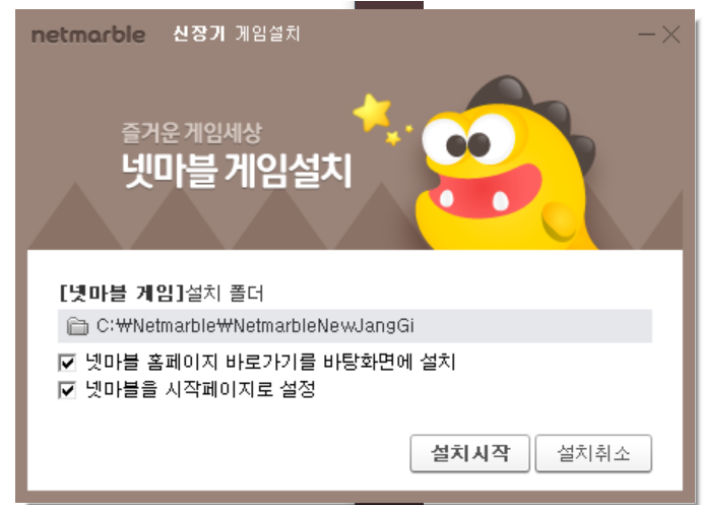 이러한 화면이 나오면 한번더 설치시작을 누르시면 됩니다. 넷마블 홈페이지 바로가기는 선택을 해두시는 것이 좋지만 '넷마블을 시작페이지로 설정'은 취소를 하시는것이 편리합니다.