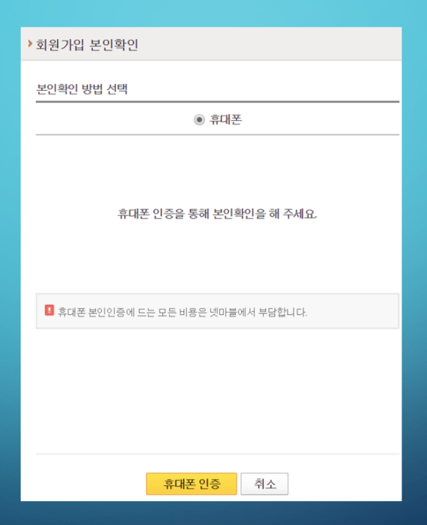 이 화면에서 상단의 인증방법에서 '휴대폰'을 클릭을 한다음에 아래의 노란박스 '휴대폰 인증'을 클릭을 합니다.
