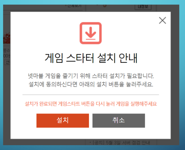 넷마블의 다른 게임을 설치한 적이 없다면 위와 같은 화면이 나오게 됩니다. 넷마블 게임을 즐기기 위해서는 넷마블 게임스타터 설치가 필요합니다. '설치'를 클릭을 하면 파일 다운로드가 됩니다. 파일 다운로드가 완료가 되면 다운로드한 파일을 클릭을 해서 설치를 진행합니다.