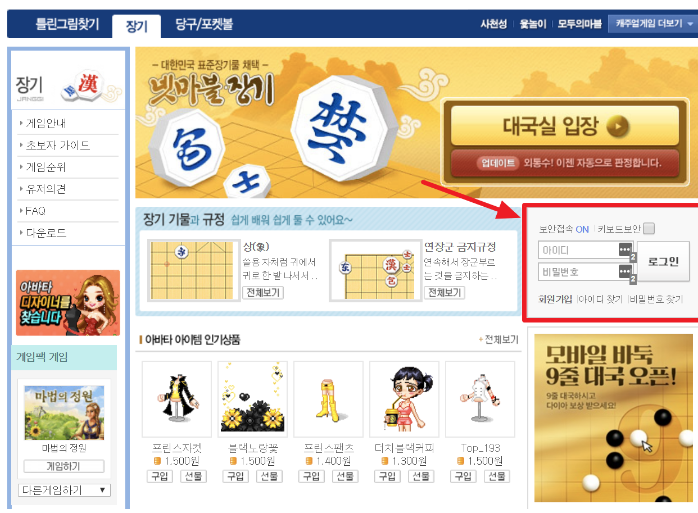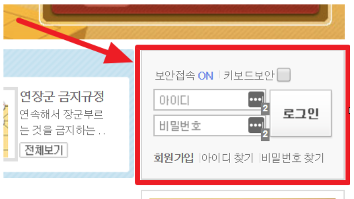 S넷마블 장기설치 하기 위해서는 당연하겠지만 로그인을 해야 합니다. 로그인하는 곳은 아래 이미지에 아이디와 비밀번호를 치시면 됩니다.