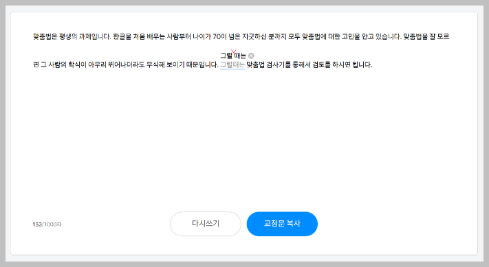 다음 맞춤법은 수정을 해주기는 하지만, 이게 왜 틀린지를 정확하게 알려주지는 않습니다. 이러한 답답함을 해결해 주는 사이트가 있습니다. 바로 부산대 맞춤법 검사기 입니다.