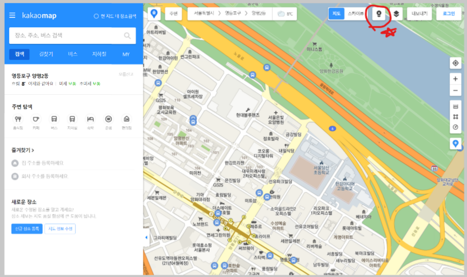 다음지도에 들어간 다음에 로드뷰를 보기 위해서는 오른쪽 위에 있는 '캠' 모양의 아이콘을 선택하시면 됩니다.